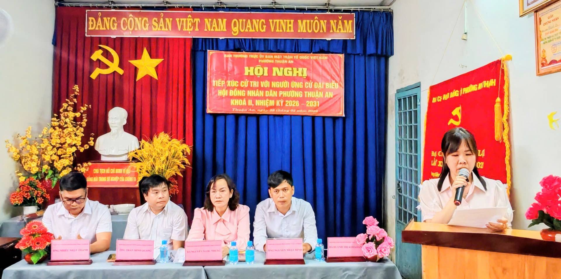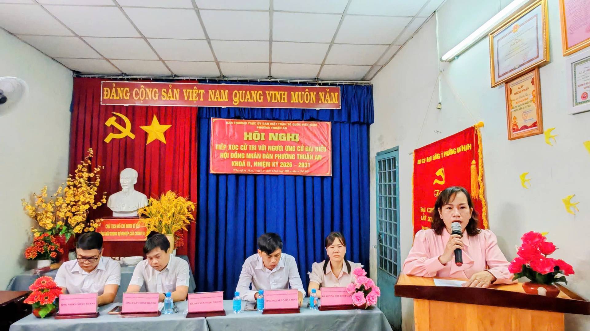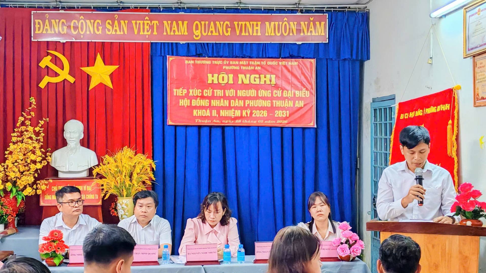 Tối ngày 28/02/2026, tại Văn phòng khu phố Thạnh Lợi, Ban Thường trực Ủy ban Mặt trận Tổ quốc (MTTQ) Việt Nam phường Thuận An tổ chức Hội nghị tiếp xúc cử tri với người ứng cử Đại biểu HĐND phường Thuận An Khoá II, nhiệm kỳ 2026 – 2031 (Đơn vị bầu cử số 5), để nghe những người ứng cử báo cáo trước cử tri về chương trình hành động của bản thân nếu được bầu vào đại biểu HĐND phường Thuận An.