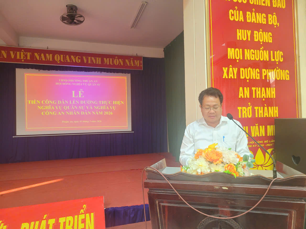 Sáng ngày 03/3/2026, tại Ban chỉ huy Quân sự phường Thuận An, lãnh đạo Đảng ủy – HĐND – UBND – UB MTTQ Việt Nam phường đã tổ chức buổi gặp gỡ, động viên các thanh niên chuẩn bị lên đường thực hiện nghĩa vụ quân sự năm 2026.
