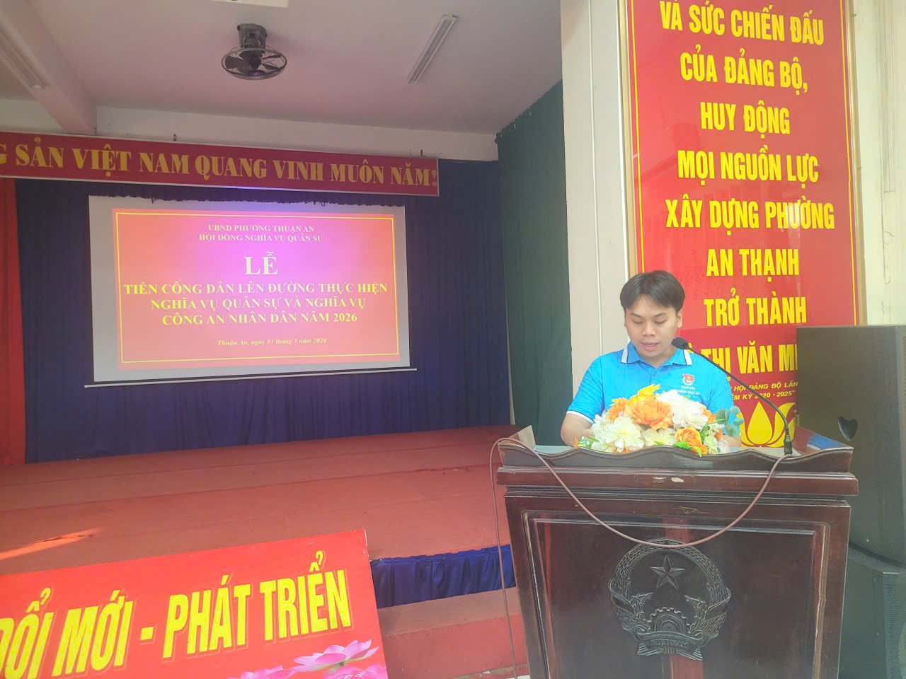 Tại hội nghị thanh niên Quách Tuấn Khang đại diện cho 64 thanh niên trúng tuyển nghĩa vụ Quân sự và nghĩa vụ Công an nhân dân phát biểu sự quyết tâm và hứa thực hiên tốt nghĩa vụ quân sự thể hiện truyền thống yêu nước của phường thuân an trước khi lên đường nhập ngũ.