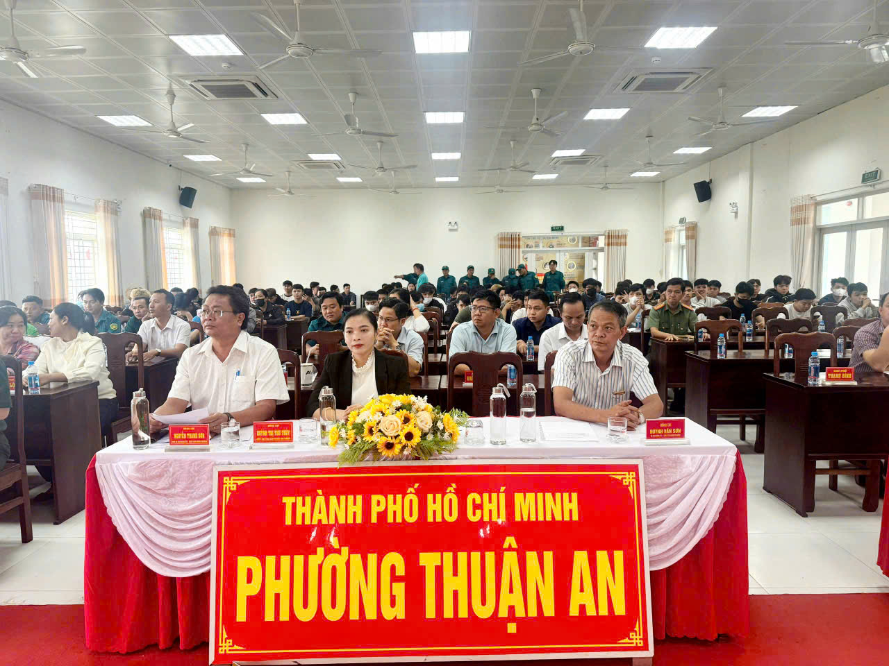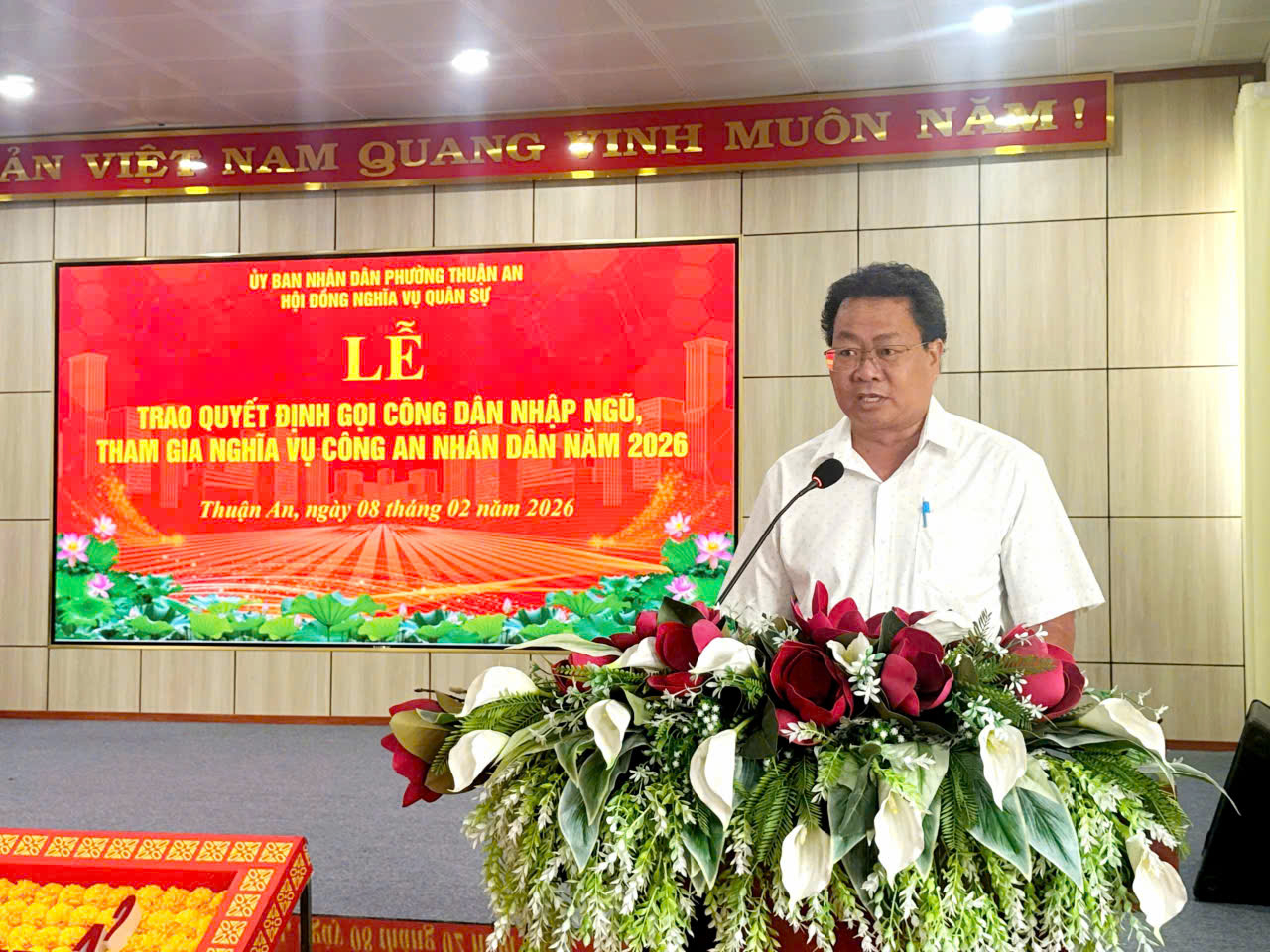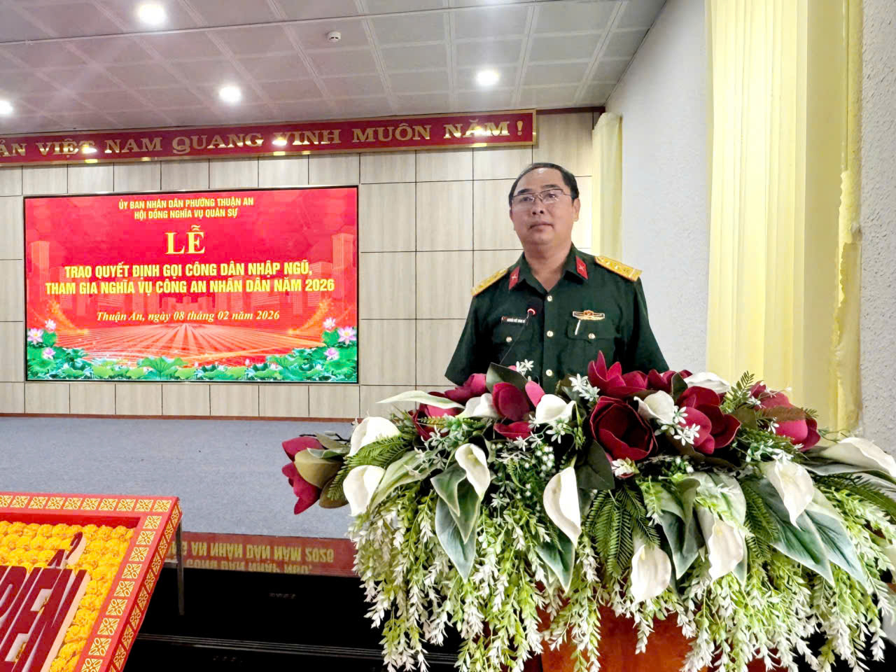 Sáng ngày 08/02/2026, tại Hội trường UBND phường Thuận An tổ chức trao Quyết định gọi công dân nhập ngũ và thực hiện nghĩa vụ tham gia công an nhân dân năm 2026. Tham dự có đồng chí Huỳnh Văn Sơn – Bí thư Đảng ủy, Chủ tịch HĐND phường; đồng chí Nguyễn Thanh Sơn – Phó Bí thư Đảng ủy, Chủ tịch UBND, Chủ tịch Hội đồng NVQS phường; đồng chí Huỳnh Thị Thu Thủy – UV.BTV Đảng ủy, Chủ tịch UBMTTQ Việt Nam phường; đồng chí Đỗ Ngọc Ẩn – UV.BTV Đảng ủy, Trưởng Công an phường; đồng chí Nguyễn Viết Minh Đức – CHT Ban CHQS phường; cùng các đồng chí là Thành viên Hội đồng NVQS phường, các đồng chí Trưởng, phó các ban ngành đoàn thể phường; Bí thư, Trưởng 15 khu phố và sự có mặt 67 thanh niên trúng tuyển NVQS và nghĩa vụ Công an nhân dân năm 2026 cùng dự.