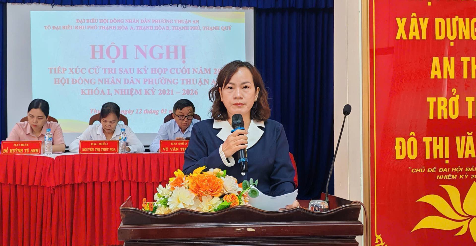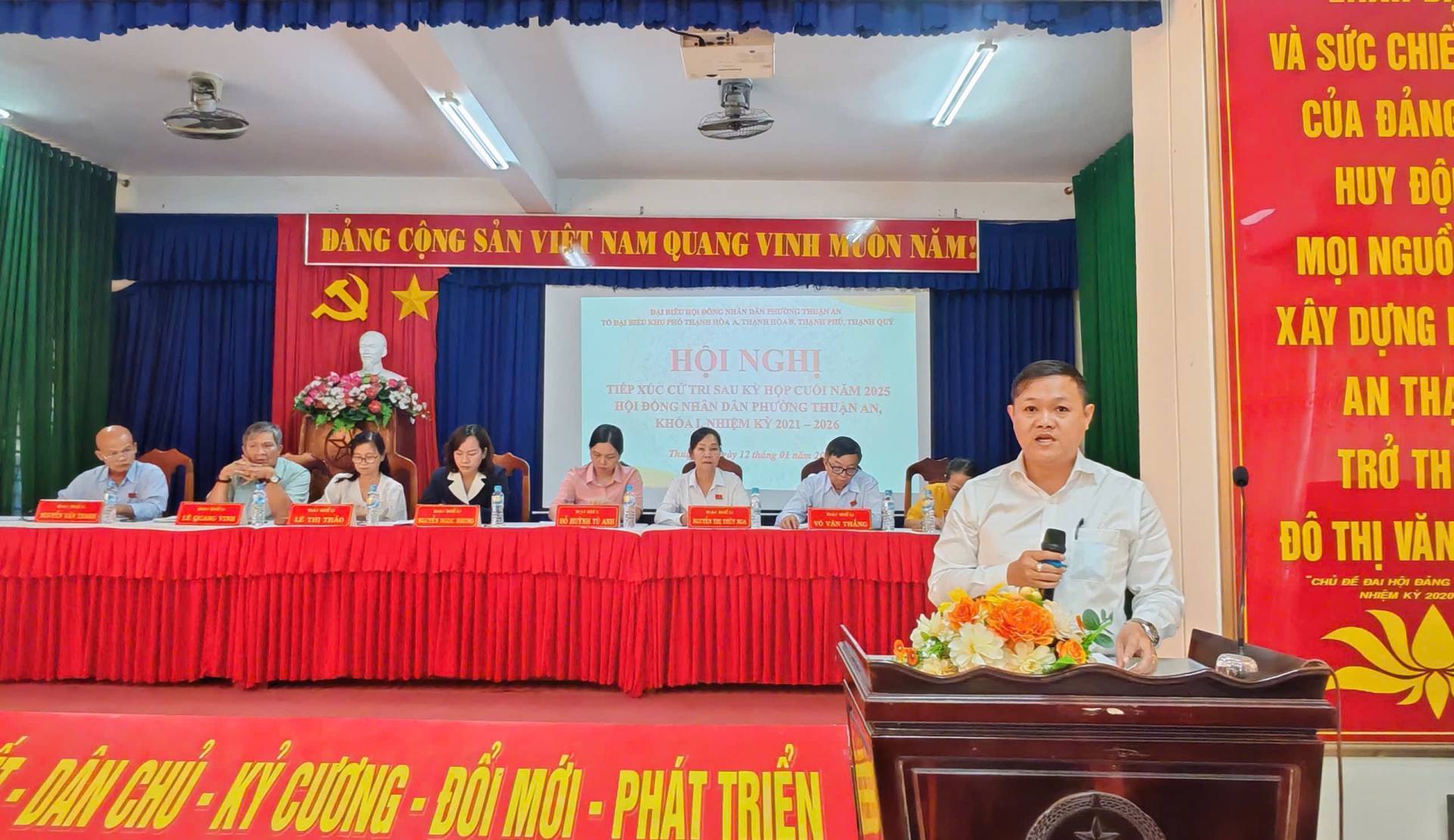 Ngày 12/01, Ban Thường trực Ủy ban Mặt trận Tổ quốc Việt Nam phối hợp với HĐND, UBND phường Thuận An tổ chức Hội nghị tiếp xúc cử tri sau kỳ họp thường lệ cuối năm 2025, HĐND phường khóa I, nhiệm kỳ 2021–2026, với 4 khu phố: (khu phố Thành Hòa A; Thạnh Hòa B; Thạnh Phú; Thạnh Qúy), tại điểm tiếp xúc Ban chỉ huy quân sự phường Thuận An. Đồng chí Trần Duy Khoa, Phó Chủ tịch Ủy ban MTTQ Việt Nam, Chủ tịch Hội Cựu Chiến binh phường chủ trì hội nghị.