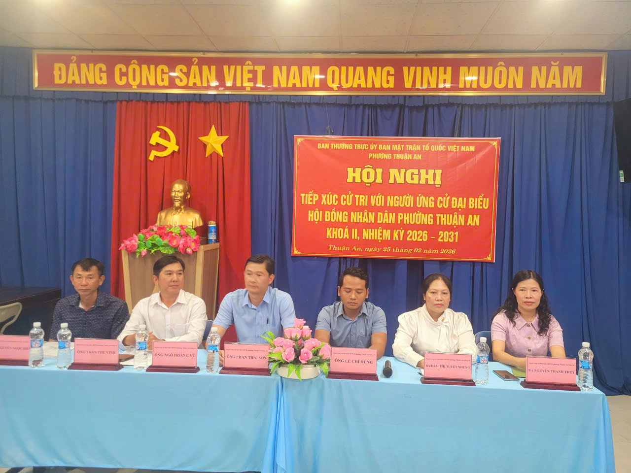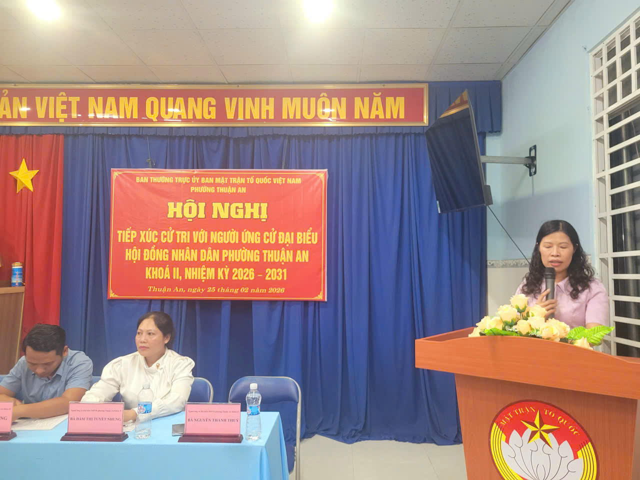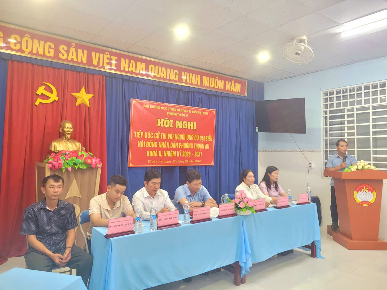 Thực hiện kế hoạch số 38/KH-MTTQ-BTT ngày 14/02/2026 của Ban Thường trực Ủy ban Mặt trận Tổ quốc Việt Nam phường Thuận An về việc tổ chức cho người ứng cử đại biểu Quốc hội khóa XVI và đại biểu Hội đồng nhân dân các cấp nhiệm kỳ 2026 - 2031 tiếp xúc cử tri vận động bầu cử trên địa bàn phường Thuận An.