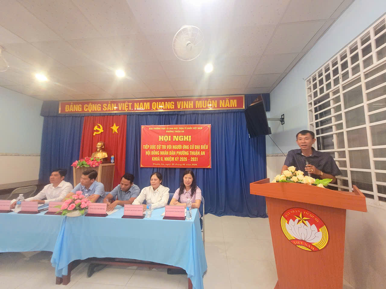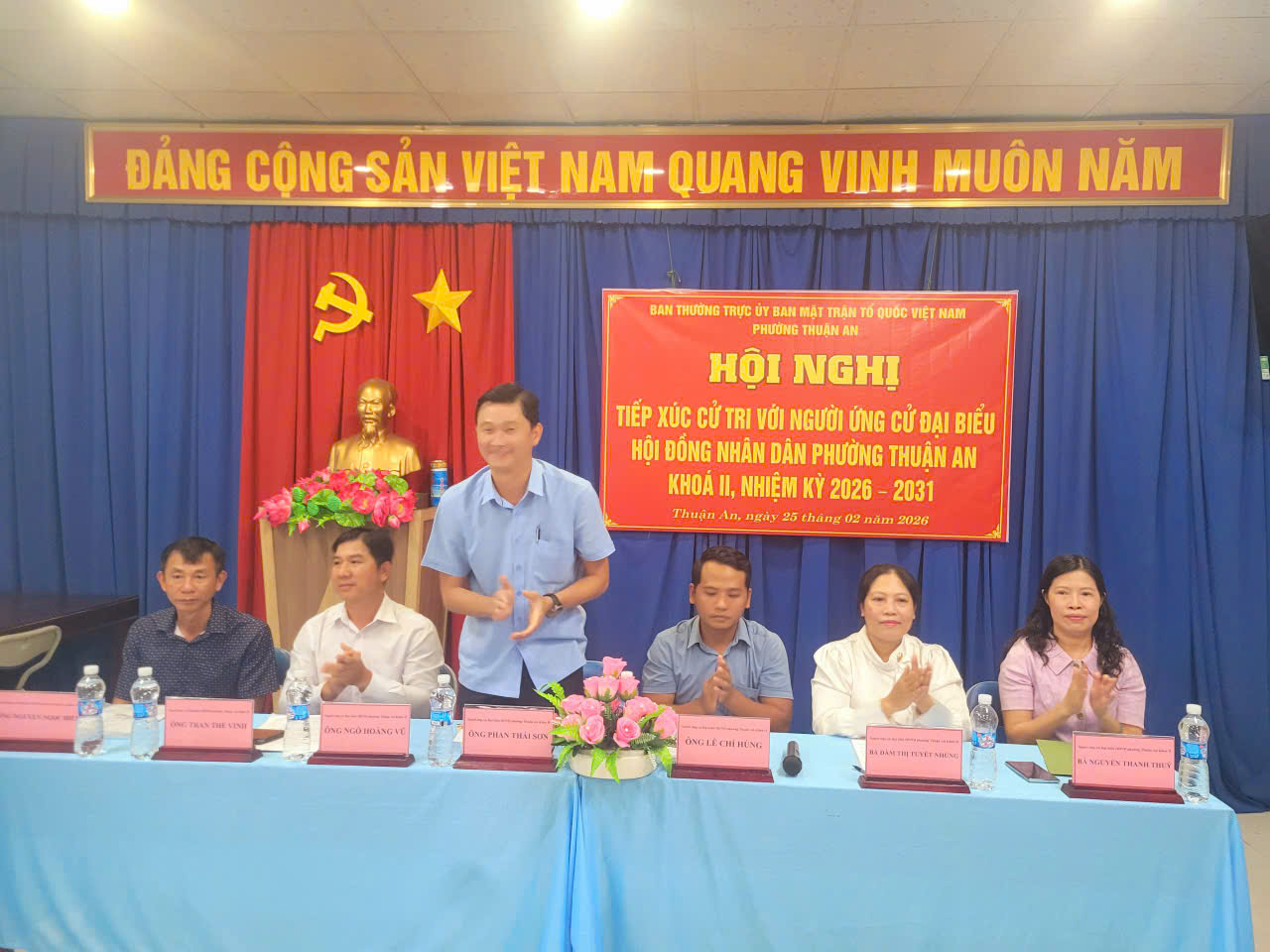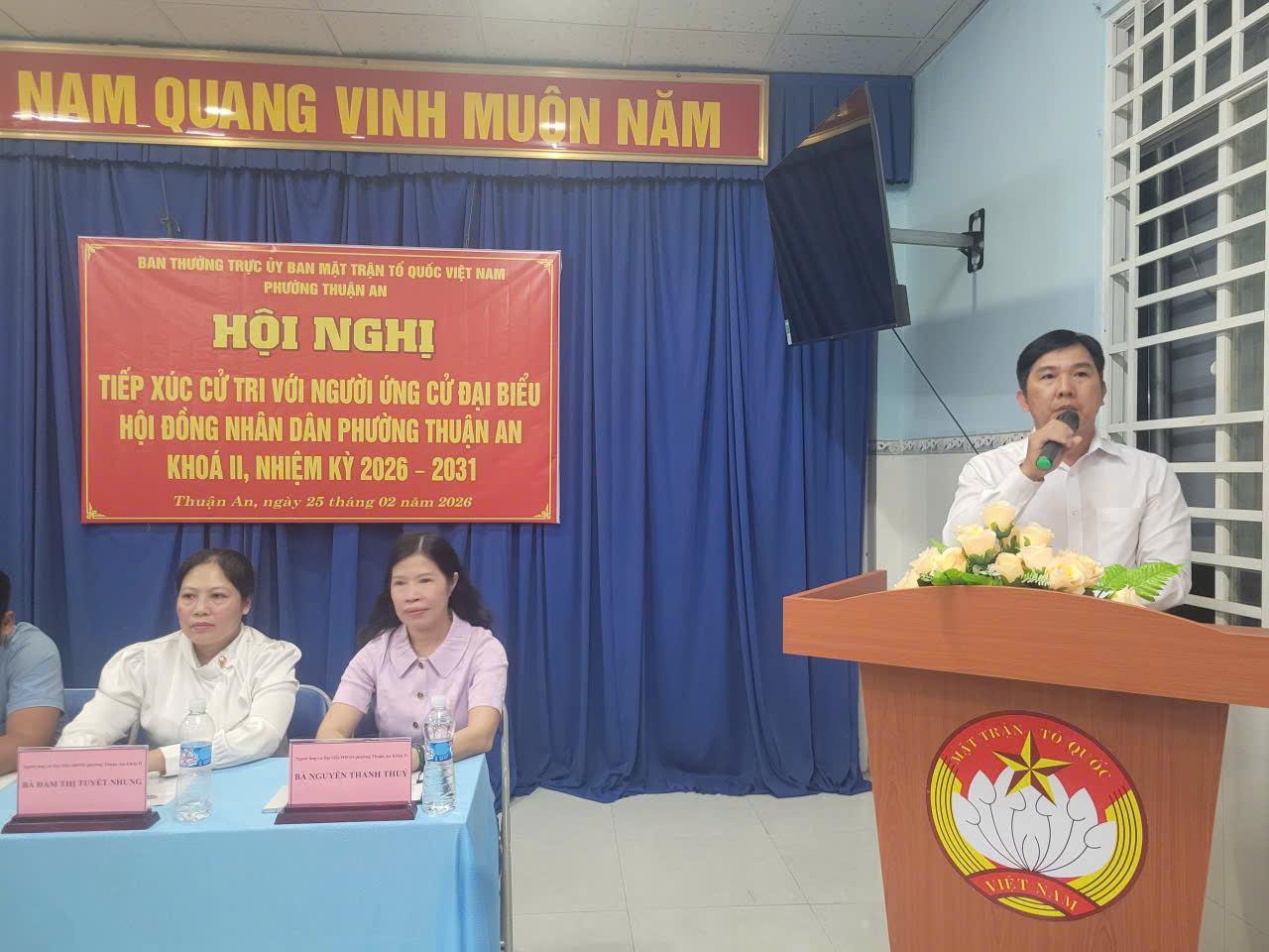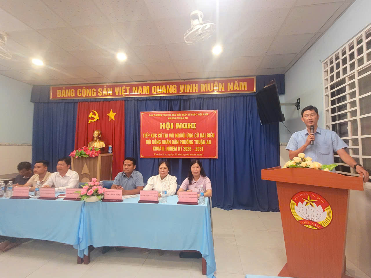 Thực hiện kế hoạch số 38/KH-MTTQ-BTT ngày 14/02/2026 của Ban Thường trực Ủy ban Mặt trận Tổ quốc Việt Nam phường Thuận An về việc tổ chức cho người ứng cử đại biểu Quốc hội khóa XVI và đại biểu Hội đồng nhân dân các cấp nhiệm kỳ 2026 - 2031 tiếp xúc cử tri vận động bầu cử trên địa bàn phường Thuận An.