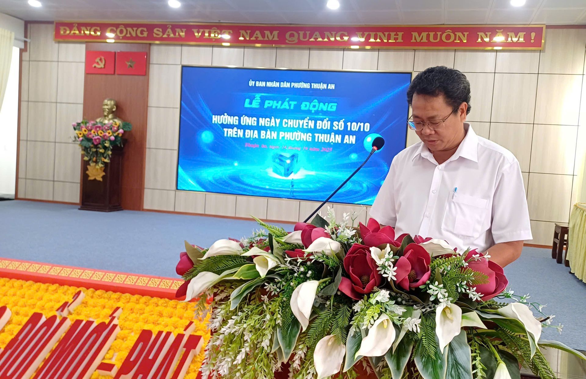 Tại Lễ phát động Ông Lê Minh Đức- ĐUV, Trưởng phòng VHXH phường thay mặt UBND phường Thuận An thông qua quyết định thành lập 15 Tổ công nghệ số cộng đồng. Ông Nguyễn Thanh Sơn – Phó Bí thư Đảng ủy/Chủ tịch UBND phường Thuận An đã phát biểu phát động hưởng ứng Ngày chuyển đổi số với chủ đề: “Chuyển đổi số toàn dân, toàn diện, toàn trình để tăng tốc, bứt phá phát triển kinh tế số". Thông điệp hành động của chúng ta là: “Chuyển đổi số: nhanh hơn, hiệu quả hơn, gần dân hơn". Ông đề nghị các cơ quan, đơn vị, trường học, trạm Y tế và khu phố tăng cường công tác tuyên truyền hưởng ứng Ngày Chuyển đổi số Quốc gia. Đẩy mạnh truyền thông qua hệ thống truyền thanh phường, cổng thông tin điện tử và mạng xã hội, nhằm lan tỏa các mô hình, nội dung, cách làm sáng tạo trong chuyển đổi số. Cần phát huy vai trò của Tổ Công nghệ số cộng đồng trong việc hướng dẫn người dân cài đặt, sử dụng App "CÔNG DÂN SỐ" và đăng ký chữ ký số trên ứng dụng VneID. Với phương châm "đi từng ngõ, gõ từng nhà, hướng dẫn từng người" để phổ cập kỹ năng số và hướng dẫn người dân thực hiện dịch vụ công trực tuyến. Phấn đấu đạt 100% người hưởng lương hưu, trợ cấp bảo hiểm xã hội, trợ cấp thất nghiệp trên địa bàn phường được chi trả thông qua thanh toán không dùng tiền mặt.