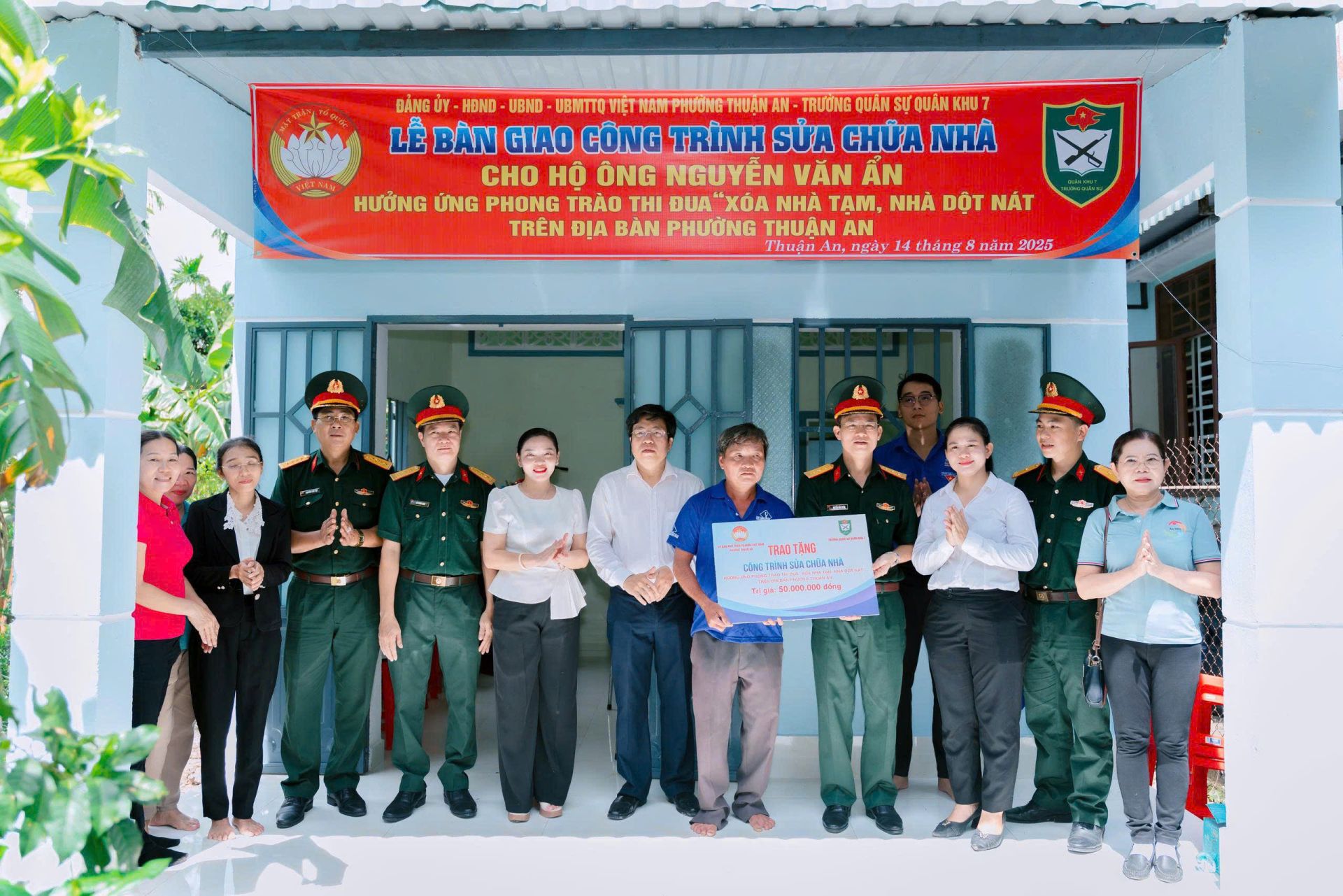 Sáng ngày 14/8/2025, UB.MTTQ Việt Nam phường Thuận An phối hợp cùng trường Quân sự Quân khu 7 tổ chức lễ bàn giao công trình sửa chữa nhà cho hộ bà Bùi Thị Kim Hồng - khu phố An Phú và hộ ông Nguyễn Văn Ẩn - khu phố An Hoà.