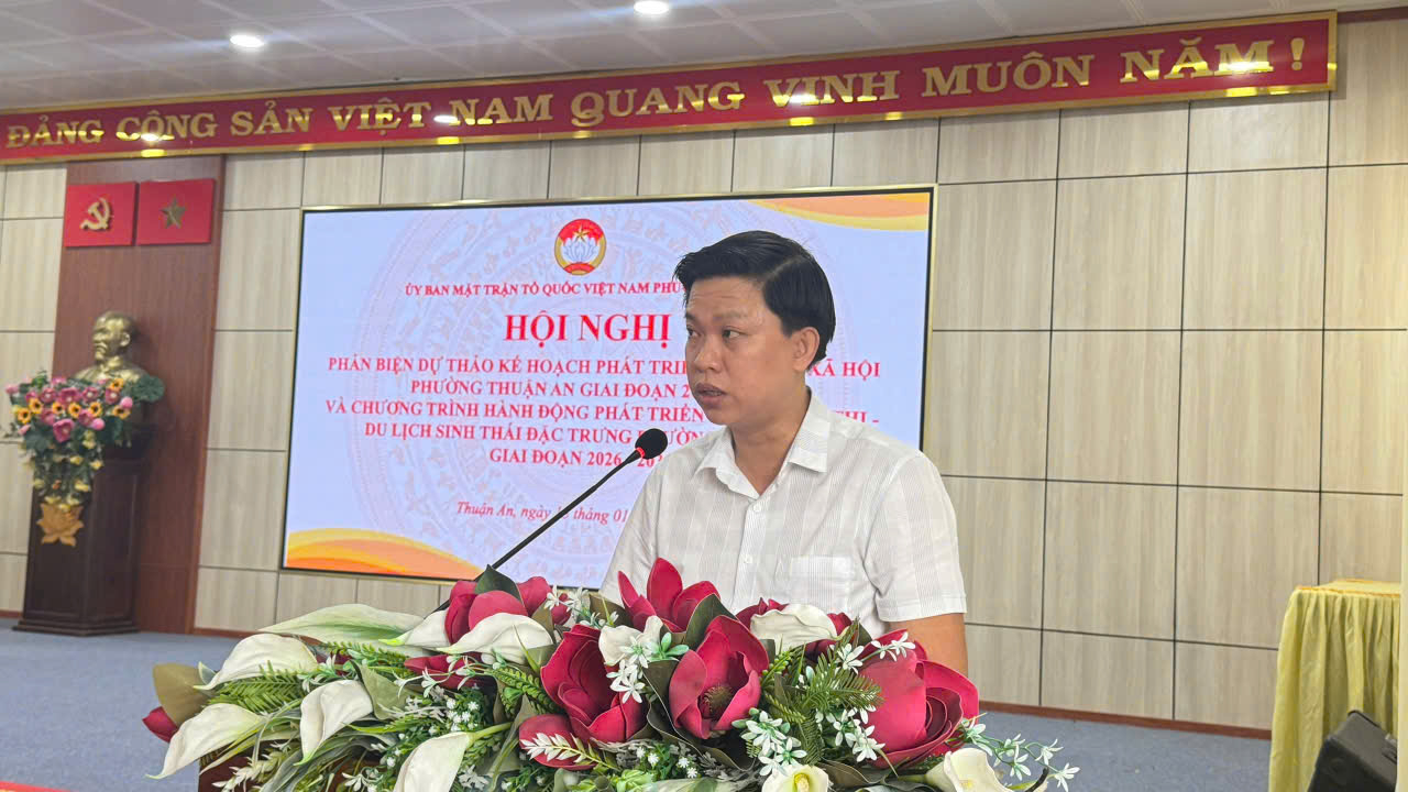 MTTQ VIỆT NAM PHƯỜNG: TỔ CHỨC HỘI NGHỊ PHẢN BIỆN VỀ DỰ THẢO KẾ HOẠCH PHÁT TRIỂN KINH TẾ - XÃ HỘI PHƯỜNG THUẬN AN GIAI ĐOẠN 2025-2030 VÀ CHƯƠNG TRÌNH HÀNH ĐỘNG PHÁT TRIỂN DỊCH VỤ ĐÔ THỊ, DỊCH VỤ SINH THÁI ĐÔ THỊ PHƯỜNG THUẬN AN GIAI ĐOẠN 2026 - 2030.
