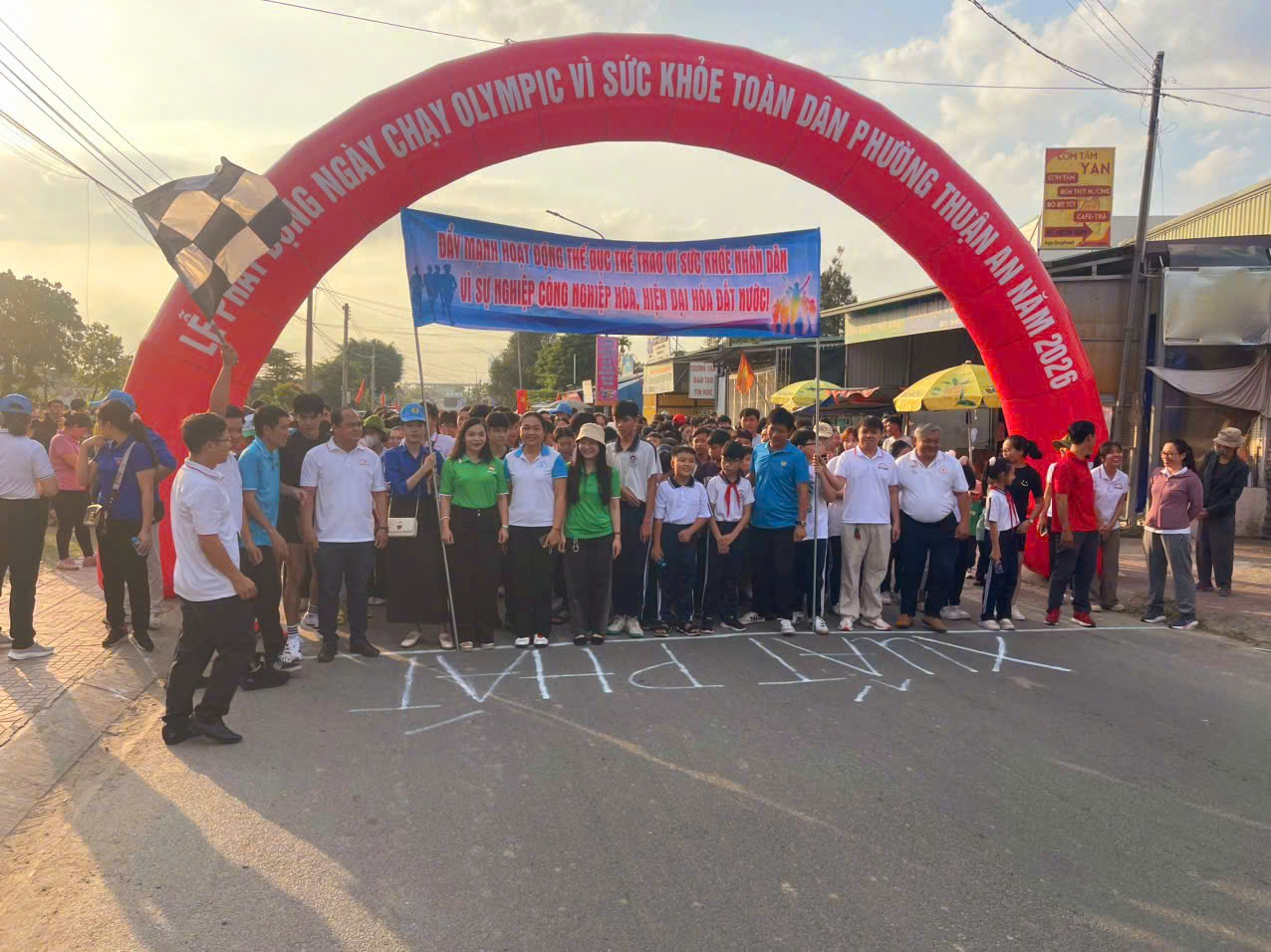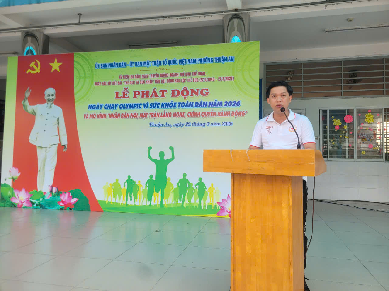 Sáng ngày 22/3/2026, tại Trường Trung học cơ sở Nguyễn Trung Trực (tại đường Hưng Định 31, khu phố Hưng Thọ). Lãnh đạo Đảng ủy – HĐND – UBND – UBMTTQ Việt Nam phường Thuận An phát động chạy Olympic vì sức khỏe toàn dân phường Thuận An năm 2026. Tham dự buổi lễ có đồng chí Ngô Tiến Đạt – UVTV, Phó Chủ tịch UBND phường; đồng chí Lý Bình Sơn – UVTV, Chủ nhiệm UBKT Đảng ủy; đồng chí Huỳnh Thị Thu Thủy – UVTV, Chủ tịch MTTQ Việt Nam phường; cùng các đồng chí Đảng ủy viên các ban, ngành, đoàn thể; Bí thư, Trưởng 15 khu phố; cùng đông đảo cán bộ, công chức, viên chức, lực lượng vũ trang, học sinh, sinh viên và gần 800 người dân trên địa bàn phường Thuận An tham dự.