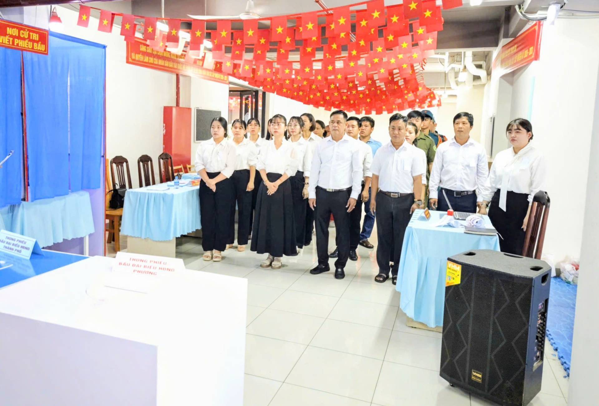 Tại khu vực bỏ phiếu số 17, Tòa nhà City Tower, khu phố Hưng Lộc, đại biểu và cử tri dự lễ khai mạc ngày bầu cử đại biểu Quốc hội khóa XVI và đại biểu HĐND các cấp nhiệm kỳ 2026-2031