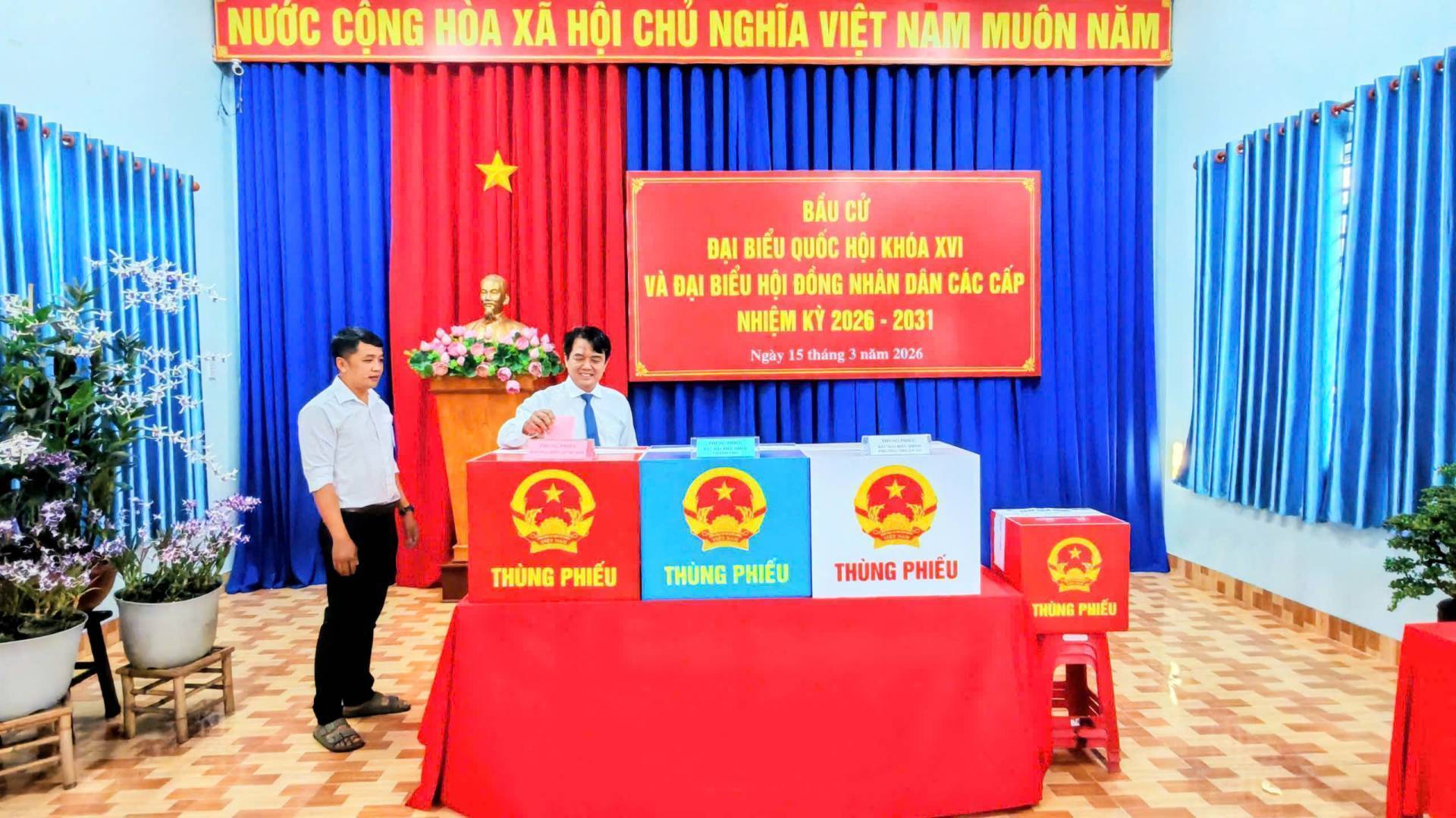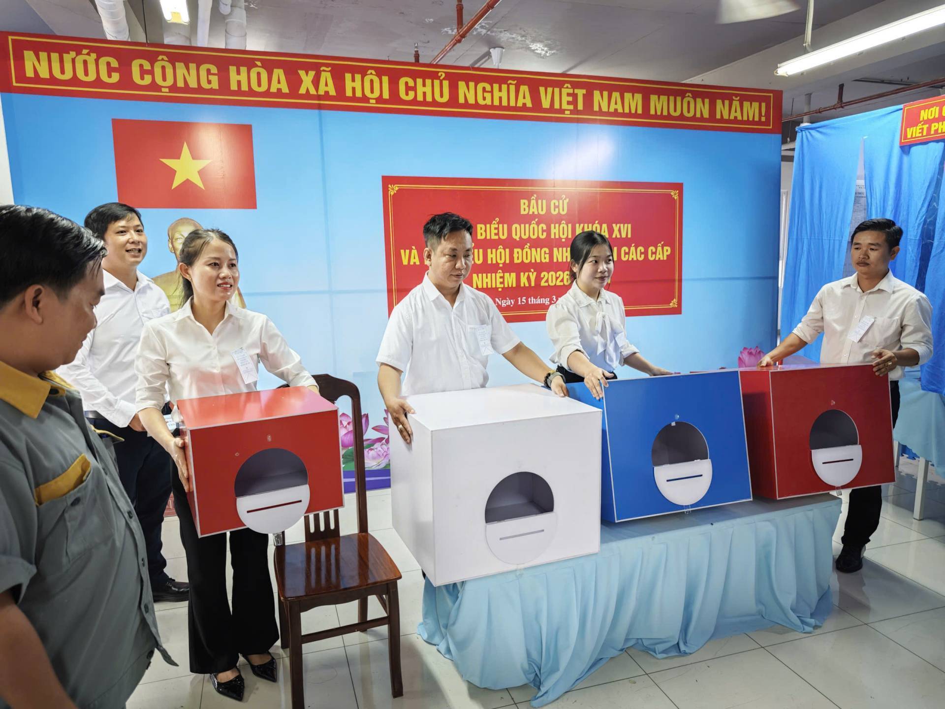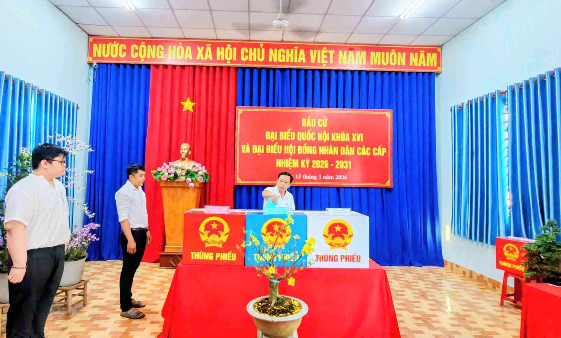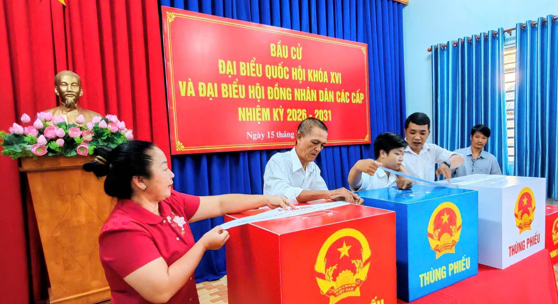 Hoạt động bỏ phiếu bắt đầu từ 7h sáng và kết thúc lúc 19h ngày 15/03/2026. Mỗi cử tri có quyền bỏ 1 phiếu bầu cử đại Quốc hội và bỏ 1 phiếu bầu đại biểu HĐND tương ứng với mỗi cấp HĐND và mình được tham gia bầu cử.