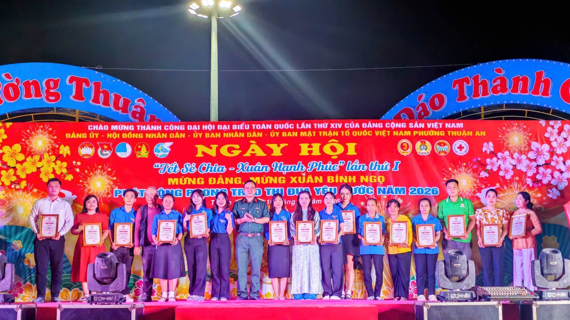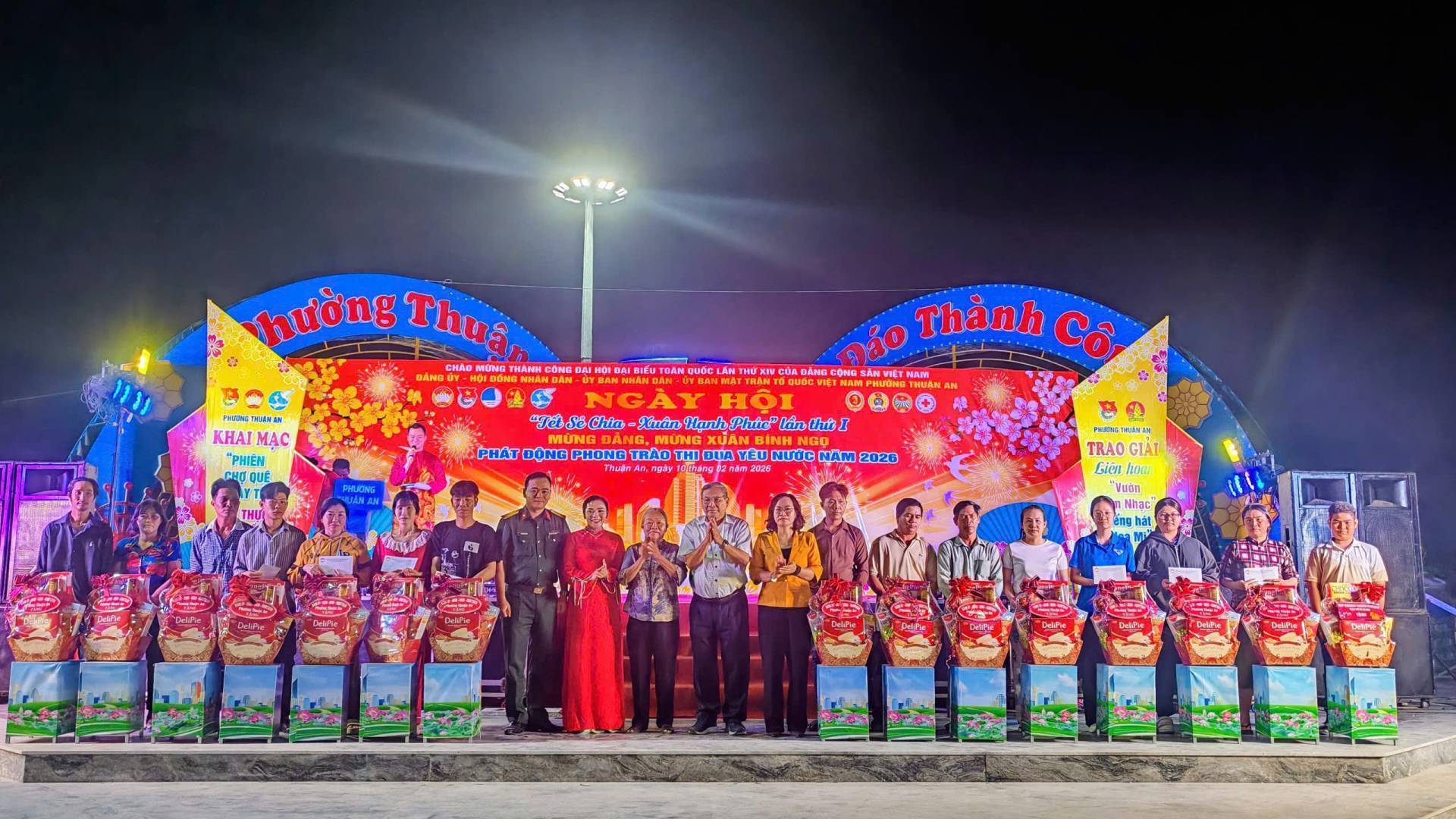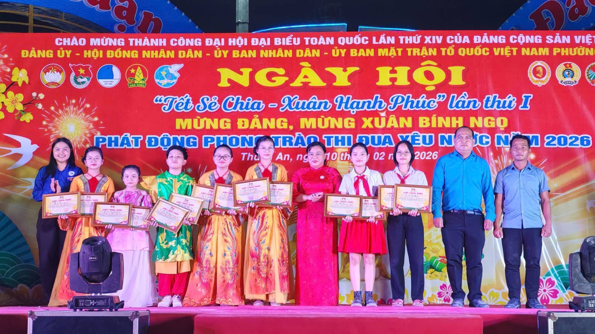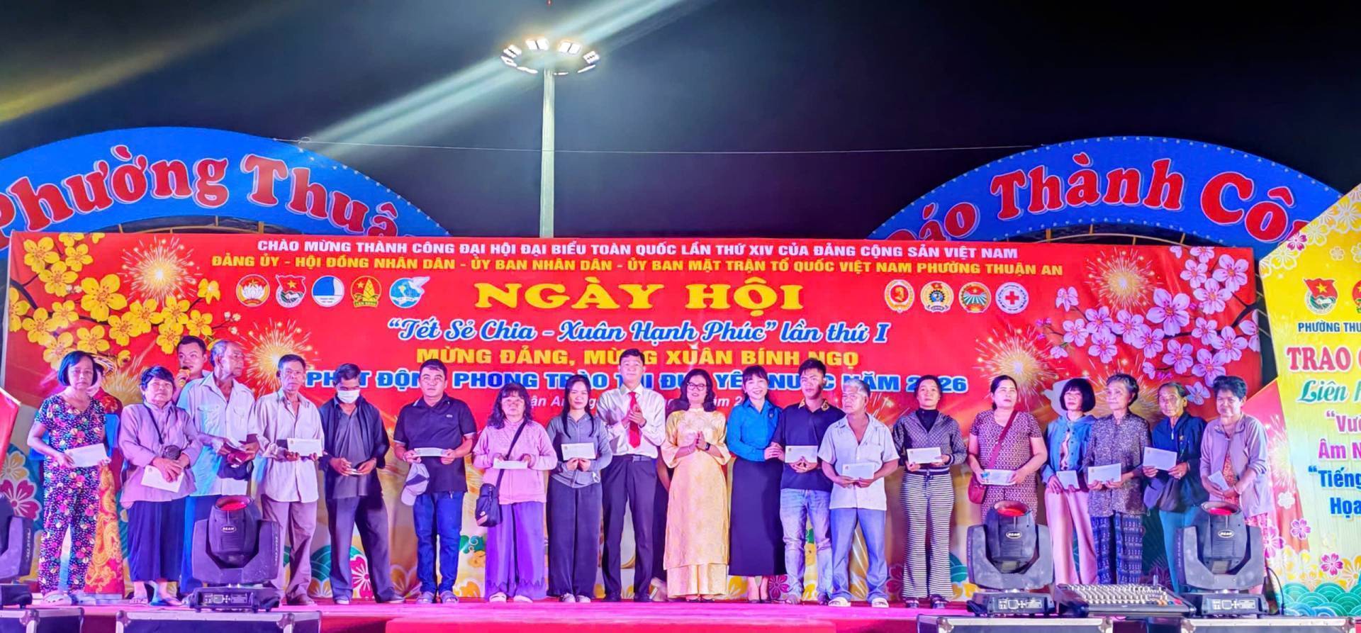 Chào mừng thành công Đại hội Đại biểu toàn quốc lần thứ XIV của Đảng Cộng sản Việt Nam, ngày 10/02/2026, tại công viên Cầu Ngang, Đảng ủy-HĐND-UBND-Ủy ban Mặt trật Tổ quốc Việt Nam phường Thuận An tổ chức chương trình Ngày hội “Tết sẻ chia – Xuân Hạnh phúc” và phát động phong trào thi đua yêu nước năm 2026; mừng Đảng, mừng Xuân Bính Ngọ năm 2026, với nhiều hoạt động ý nghĩa, ấm áp nghĩa tình. Tham dự có đồng chí Dương Thị Huyền Trâm, Trưởng Ban Công tác xã hội Ủy ban Mặt trật Tổ quốc Việt Nam TP.Hồ Chí Minh; đồng chí Đặng Thị Kim Chi, Ủy viên BTV Liên đoàn Loa động Thành phố. Tổ phó Tổ công tác quản lý địa bàn số 4; đồng chí Nguyễn Xuân Dũng- Nguyên Chánh Thanh tra tỉnh Bình Dương; đồng chí Nguyễn Thị Kim Thu – Nguyên Thị ủy viên, Trưởng Phòng Lao động và Thương binh xã hội Thị xã Thuận An; đồng chí Huỳnh Văn Sơn- Bí thư Đảng ủy, Chủ tịch HĐND phường; đồng chí Phan Thái Sơn – Phó bí thư Thường trực Đảng ủy; đồng chí Nguyễn Thanh Sơn – Phó Bí thư Đảng ủy, Chủ tịch UBND; đồng chí Huỳnh Thị Thu Thủy – UV BTV Đảng ủy, Chủ tịch UBMTTQ Việt Nam phường; đồng chí Nguyễn Ngọc Nhung – UV.BTV Đảng ủy, Phó Chủ tịch HĐND phường; Thượng tá Phan Ngọc Cường, Chính trị viên, Phó Ban Chỉ huy quân sự phường; cùng các đồng chí Bí thư Chi bộ, Trưởng Khu phố, ấp, Trưởng ban CTMT 15 khu phố, Hiệu trưởng các trường học trên địa bàn phường và hơn 1000 người dân tham dự Ngày hội.