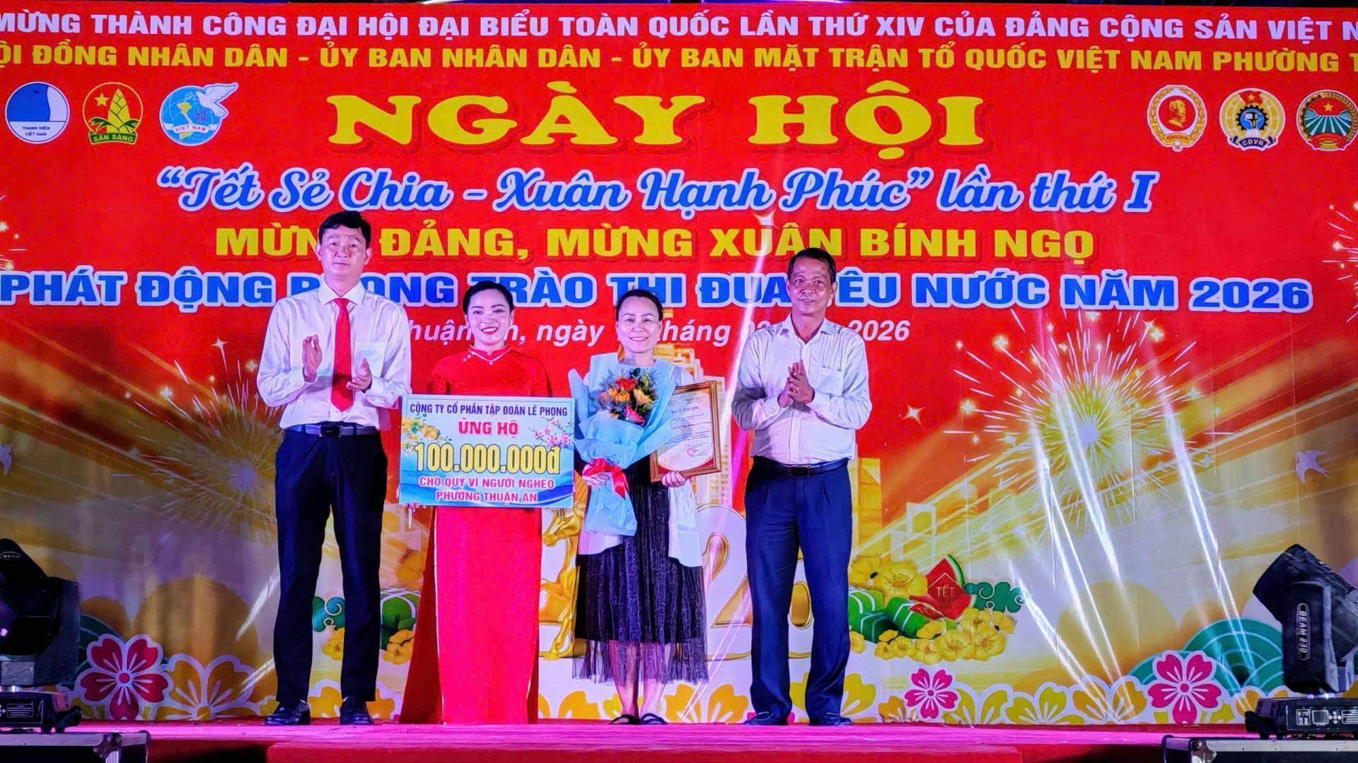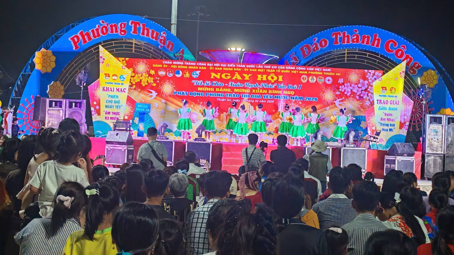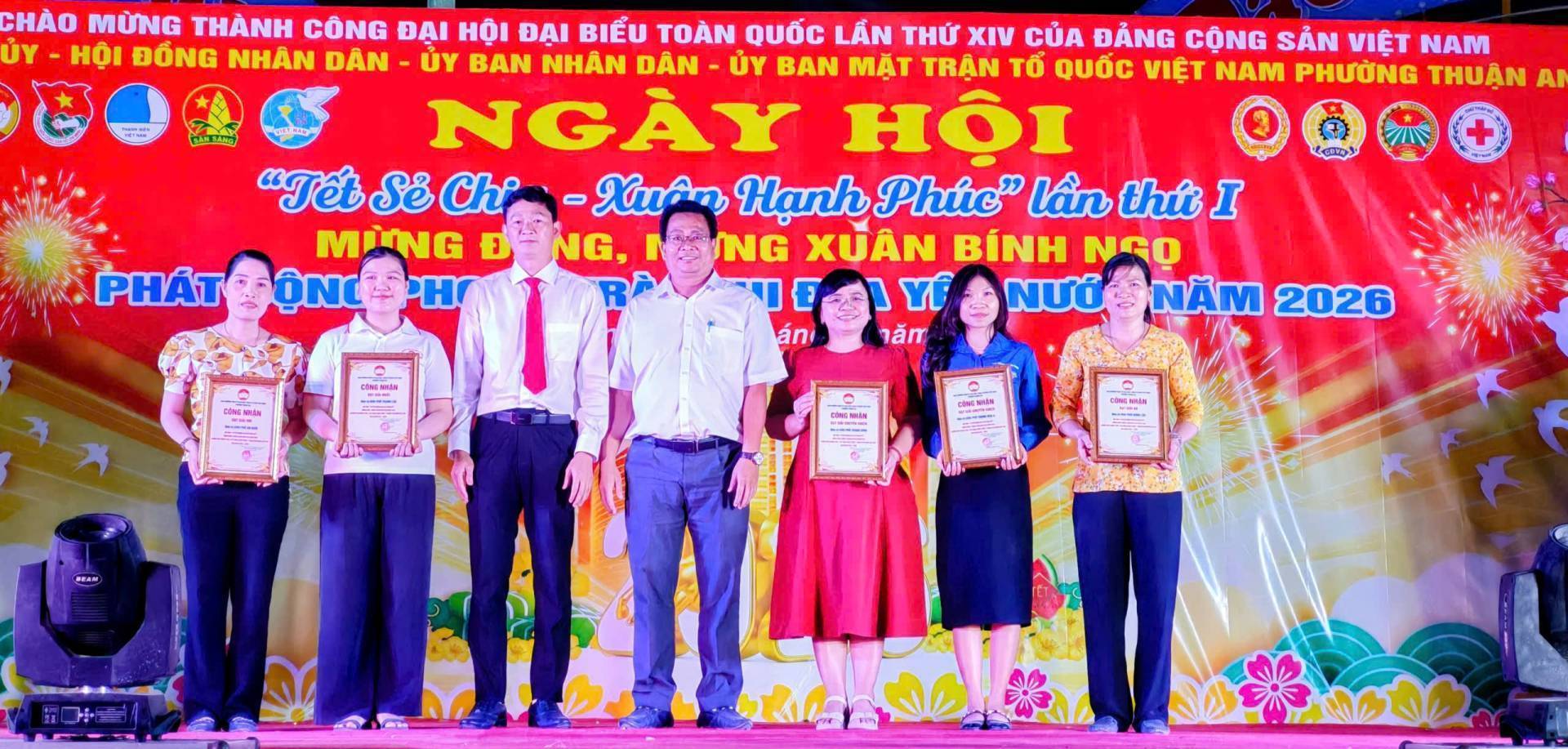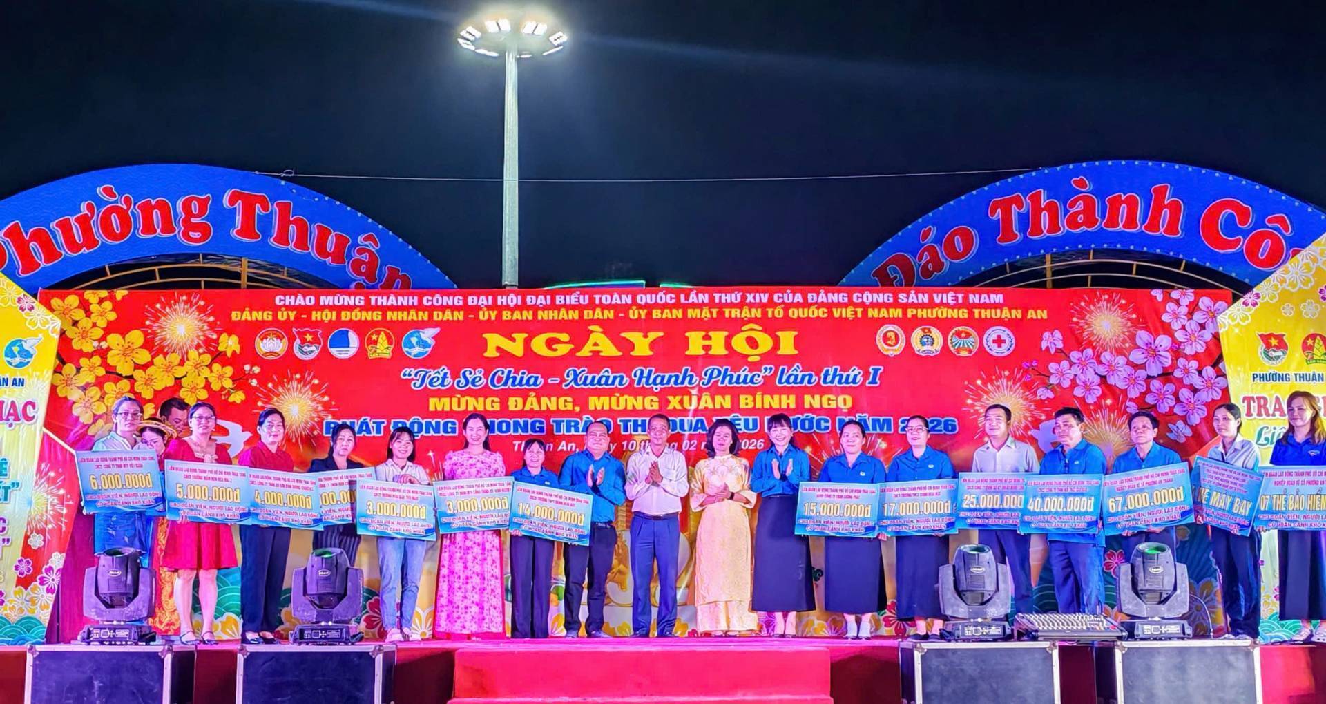 Chào mừng thành công Đại hội Đại biểu toàn quốc lần thứ XIV của Đảng Cộng sản Việt Nam, ngày 10/02/2026, tại công viên Cầu Ngang, Đảng ủy-HĐND-UBND-Ủy ban Mặt trật Tổ quốc Việt Nam phường Thuận An tổ chức chương trình Ngày hội “Tết sẻ chia – Xuân Hạnh phúc” và phát động phong trào thi đua yêu nước năm 2026; mừng Đảng, mừng Xuân Bính Ngọ năm 2026, với nhiều hoạt động ý nghĩa, ấm áp nghĩa tình. Tham dự có đồng chí Dương Thị Huyền Trâm, Trưởng Ban Công tác xã hội Ủy ban Mặt trật Tổ quốc Việt Nam TP.Hồ Chí Minh; đồng chí Đặng Thị Kim Chi, Ủy viên BTV Liên đoàn Loa động Thành phố. Tổ phó Tổ công tác quản lý địa bàn số 4; đồng chí Nguyễn Xuân Dũng- Nguyên Chánh Thanh tra tỉnh Bình Dương; đồng chí Nguyễn Thị Kim Thu – Nguyên Thị ủy viên, Trưởng Phòng Lao động và Thương binh xã hội Thị xã Thuận An; đồng chí Huỳnh Văn Sơn- Bí thư Đảng ủy, Chủ tịch HĐND phường; đồng chí Phan Thái Sơn – Phó bí thư Thường trực Đảng ủy; đồng chí Nguyễn Thanh Sơn – Phó Bí thư Đảng ủy, Chủ tịch UBND; đồng chí Huỳnh Thị Thu Thủy – UV BTV Đảng ủy, Chủ tịch UBMTTQ Việt Nam phường; đồng chí Nguyễn Ngọc Nhung – UV.BTV Đảng ủy, Phó Chủ tịch HĐND phường; Thượng tá Phan Ngọc Cường, Chính trị viên, Phó Ban Chỉ huy quân sự phường; cùng các đồng chí Bí thư Chi bộ, Trưởng Khu phố, ấp, Trưởng ban CTMT 15 khu phố, Hiệu trưởng các trường học trên địa bàn phường và hơn 1000 người dân tham dự Ngày hội.