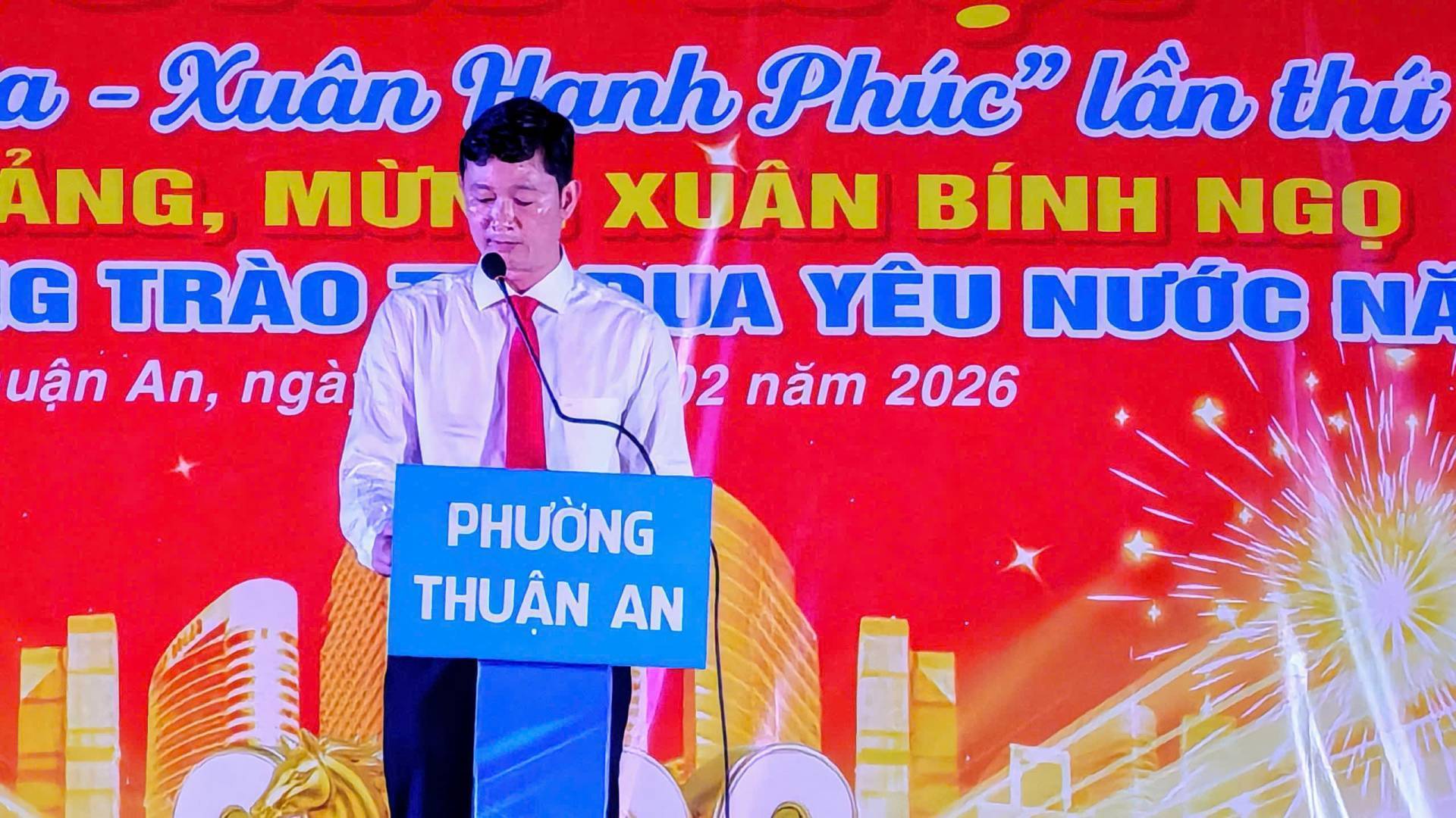 Nhân dịp này, thay mặt lãnh đạo Đảng ủy, chính quyền, Mặt trận Tổ quốc Việt Nam phường, đồng chí Phan Thái Sơn phát động phong trào thi đua yêu nước trong cán bộ, Đảng viên và nhân dân năm 2026. Với các phong trào nổi bật như: Cuộc vận động học tập và làm theo phong cách đạo đức Hồ Chí Minh, Phong trào dân vận khéo, lao động giỏi, lao động sáng tạo, Cán bộ công chức viên chức thi đua thực hiện văn hóa công sở, Phong trào cả nước chung tay vì người nghèo, Toàn dân đoàn kết xây dựng nông thôn mới, đô thị văn minh, Phong trào toàn dân bảo vệ an ninh tổ quốc, chung tay xây dựng phường Thuận An không ma túy, Phong trào bình dân học vụ số, Cuộc vận động Người Việt Nam ưu tiên dùng hàng Việt Nam...