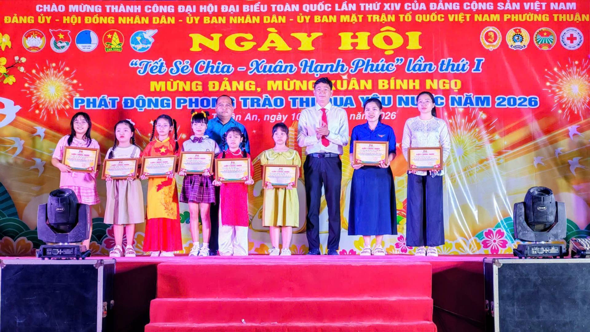 Tại Ngày hội, Ban Tổ chức đã trao các giải đạt nhất, nhì, ba cho các phần thi: Tuyến đường hoa Đại đoàn kết, Sân trường rực rỡ sắc hoa; Trang trí “Góc phố xuân” và gian hàng “Phiên Chợ quê ngày Tết”; “Ẩm thực 3 miền” mừng Xuân Bính Ngọ. Hội thi “Trang trí cành mai, cành đào”; “Gói bánh chưng, bánh tét”. Hội thi Liên hoan “Vườn âm nhạc” và Hội thi “Tiếng hát Họa mi” phường Thuận An lần thứ I – năm 2026, với chủ đề “Thiếu nhi thành phố Bác vững bước tiến vào kỷ nguyên mới”./.