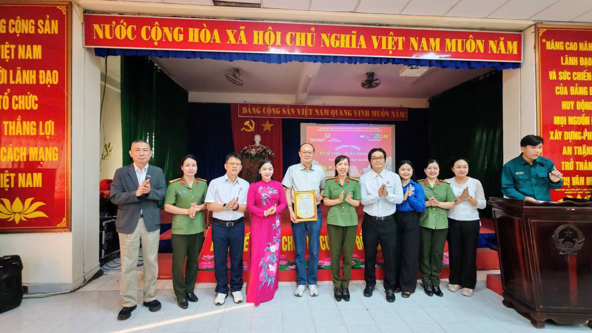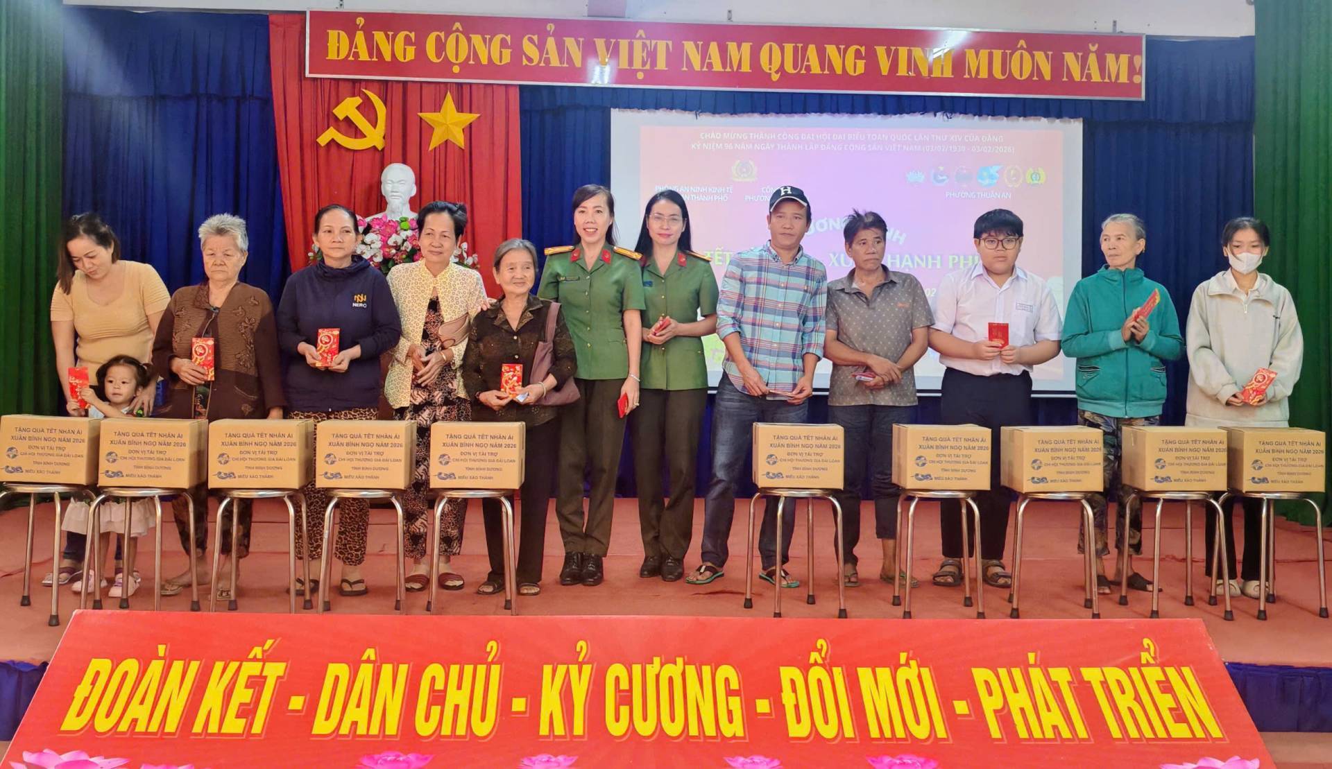 Chào mừng thành công Đại hội toàn quốc lần thứ XIV của Đảng; kỷ niệm 96 năm Ngày thành Đảng Cộng sản Việt Nam (03/02/1930 – 03/02/2026); Mừng Xuân Bính Ngọ năm 2026, sáng ngày 31/01/ 2026, tại Hội trường Ban Chỉ huy Quân sự phường Thuận An, Công an phường Thuận An phối hợp với Mặt trận Tổ quốc Việt Nam phường và Phòng An ninh kinh tế Công an Thành phố Hồ Chí Minh đã tổ chức Chương trình “Tết sẻ chia – Xuân hạnh phúc”, nhằm trao tặng quà Tết cho các hộ gia đình có hoàn cảnh khó khăn trên địa bàn phường Thuận An. Tham dự có đồng chí Huỳnh Thị Thu Thủy-UVTV, Chủ tịch UB.MTTQVN phường; Thượng tá Huỳnh Ngọc Loan-Phó Trưởng Phòng An ninh kinh tế Công an Thành phố Hồ Chí Minh; Trung tá Cao Thị Lực-Phó Trưởng Công an phường Thuận An; đại diện Hội thương gia Đài Loan-Bình Dương cùng các hộ gia đình có hoàn cảnh khó khăn trên địa bàn phường.