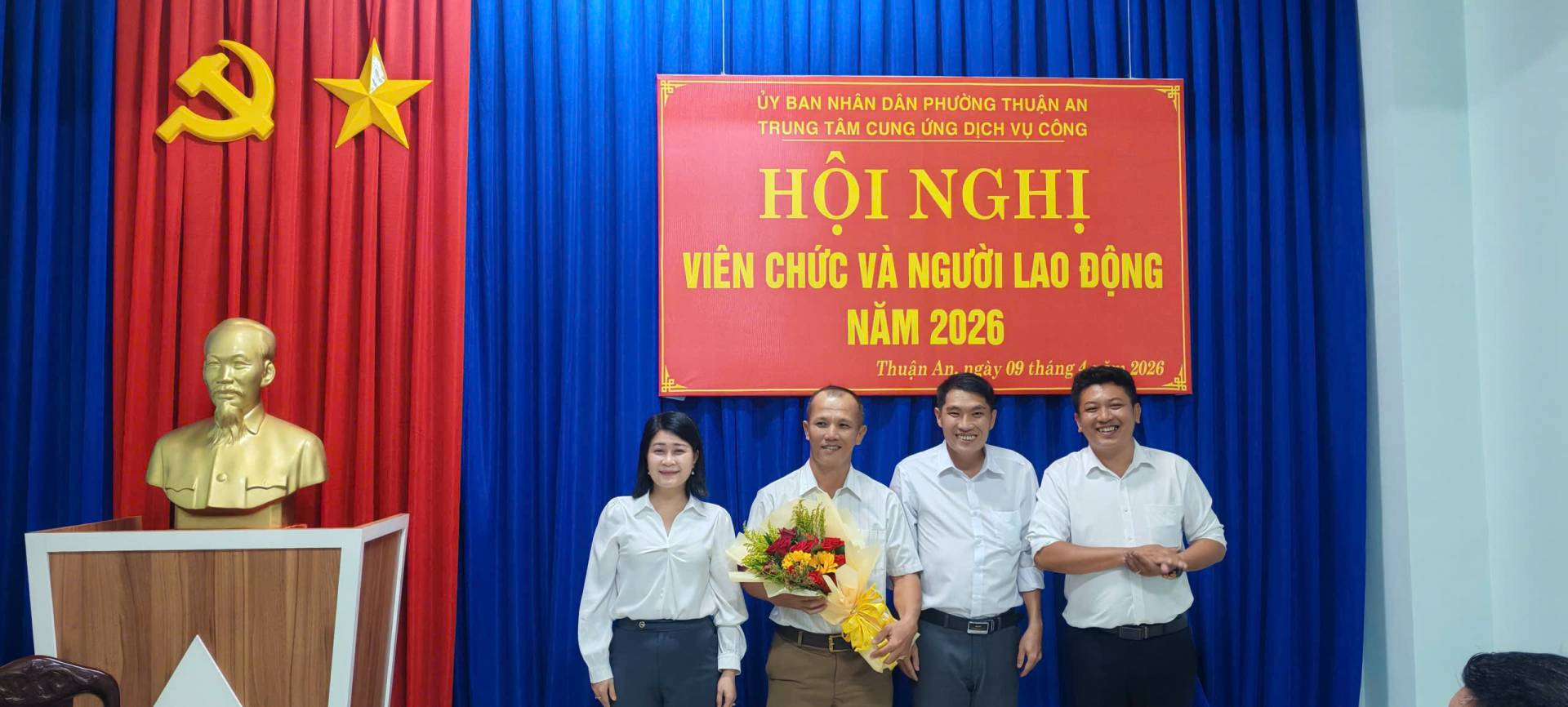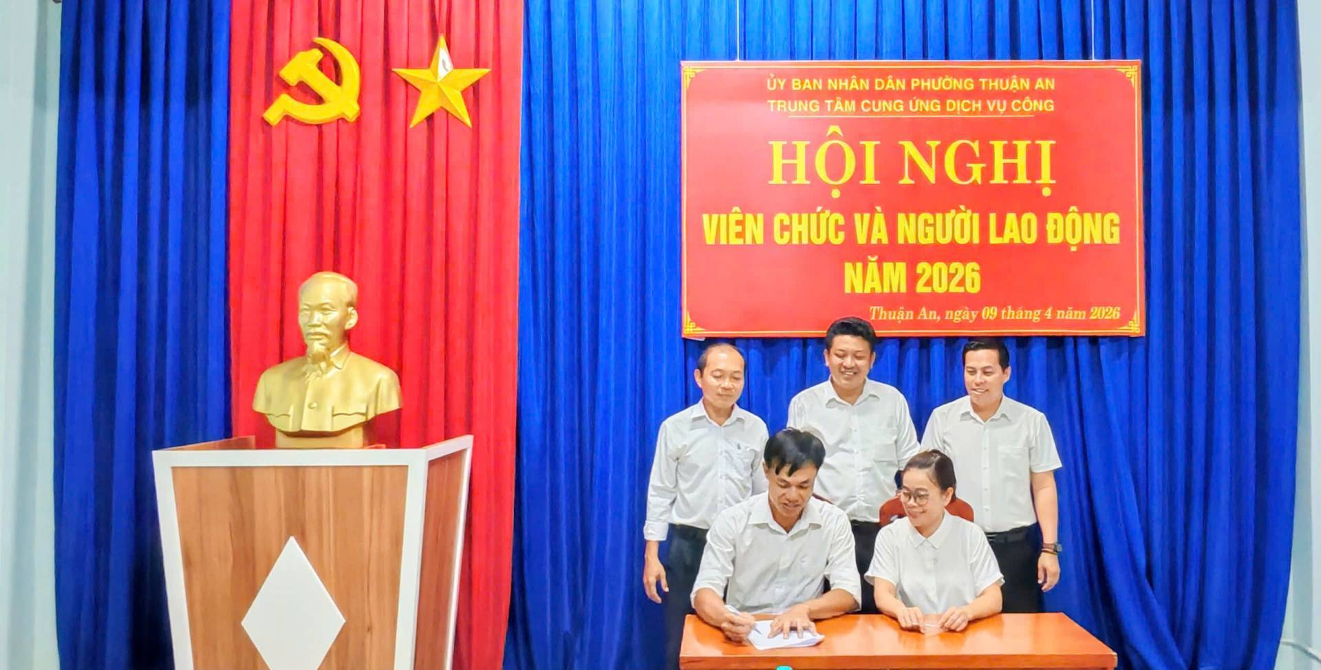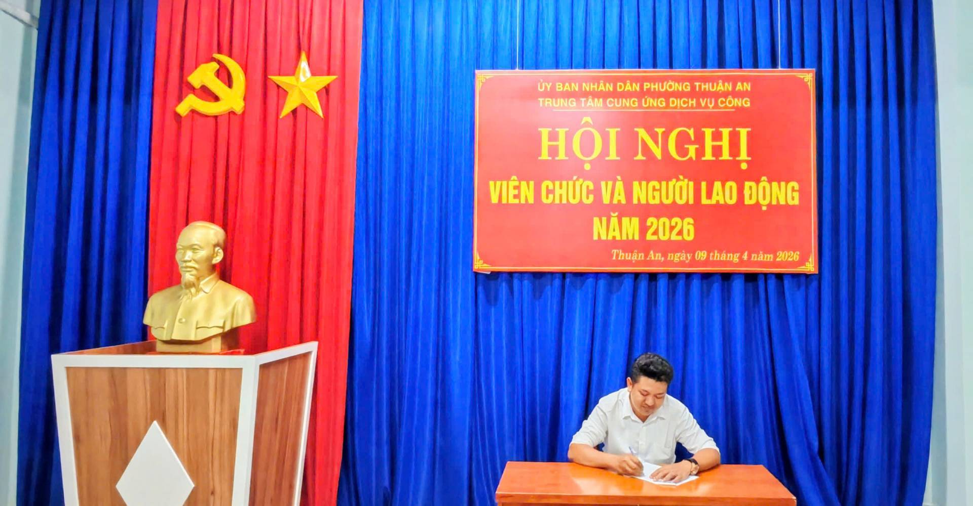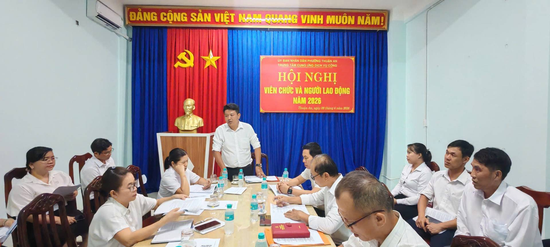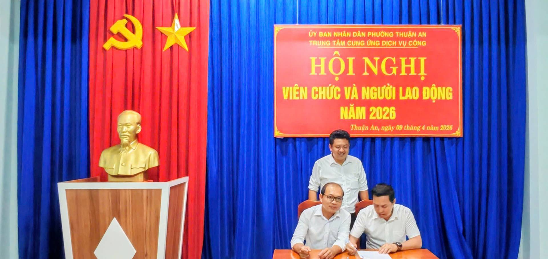 Ngày 09/04/2026, Trung tâm Cung ứng Dịch vụ công phường Thuận An (viết tắt là Trung tâm) đã long trọng tổ chức Hội nghị viên chức và người lao động (VC-NLĐ) năm 2026. Ông Huỳnh Minh Triết, Giám đốc Trung tâm chủ trì Hội nghị. Hội nghị nhằm đánh giá kết quả thực hiện nhiệm vụ năm 2025, đồng thời đề ra phương hướng, giải pháp thực hiện thắng lợi nhiệm vụ năm 2026. Tham dự hội nghị có toàn thể viên chức và người lao động.